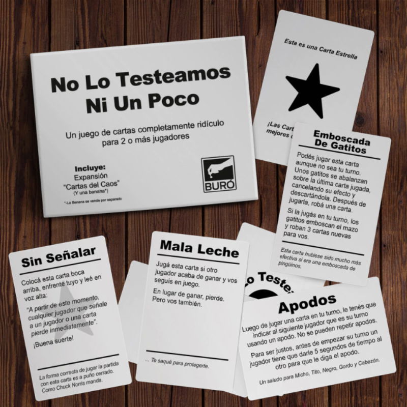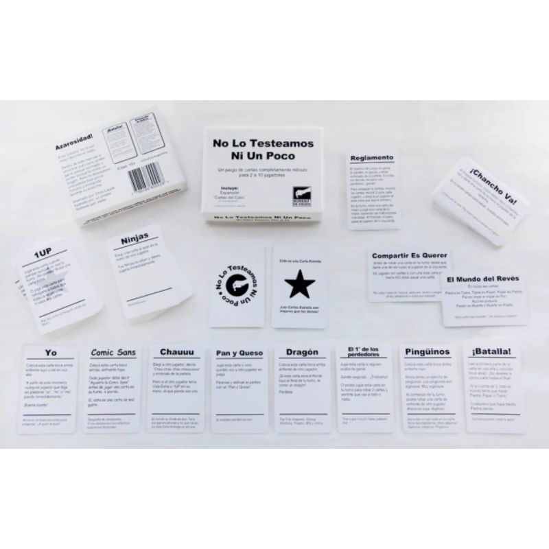 No Lo Testeamos Ni Un Poco es un juego rápido de eliminación. Ganás si sos el último en juego y cada carta tiene consignas diferentes para hacer perder a los demás de las maneras más bizarras posibles.