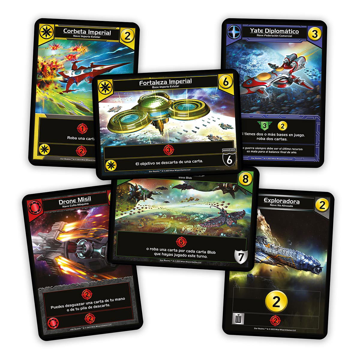 Star Realms combina la diversión de los juegos de construcción de mazos con la interactividad de los juegos de combate con cartas coleccionables. A medida que juegas, usarás el comercio para sumar nuevas naves y bases a tu mazo. Una vez puestas en juego, esas naves y bases generan poderosos efectos, comercio adicional y fuerza de combate con la que atacar al contrario y sus bases.