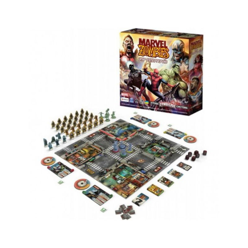 Contiene: 6 miniaturas de Superhéroes, 4 miniaturas de Héroes Zombis, 6 figuras de Transeúntes, 50 figuras de zombis, 4 peanas de colores, 8 indicadores, 4 medidores de Experiencia, 6 dados, 4 módulos de tablero de doble cara, 6 tarjetas de identificación, 71 minicartas, 27 fichas, 1 reglamento.
