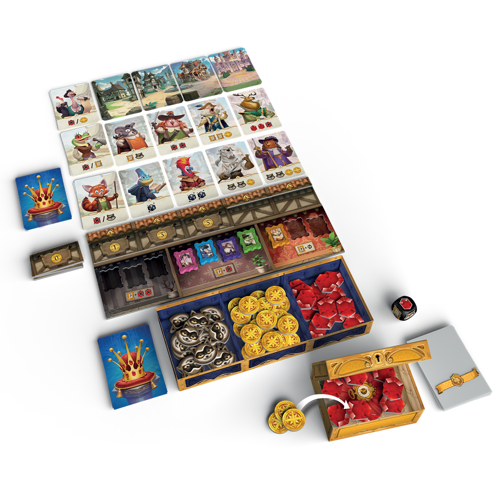 62 cartas, 32 fundas para cartas, 7 cofres, 5 peones, 1 tablero, 1 dado, 115 fichas, 11 piezas, 1 reglamento