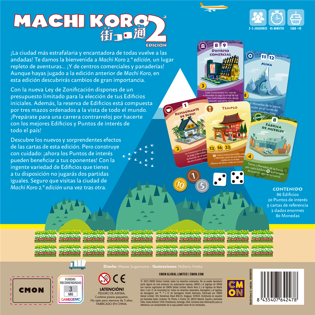¡La ciudad más estrafalaria y encantadora de todas vuelve a las andadas! Te damos la bienvenida a Machi Koro 2ª edición, un lugar repleto de aventuras… ¡Y de centros comerciales y panaderías! Aunque hayas jugado a la edición anterior de Machi Koro en esta edición descubrirás cambios de gran importancia.