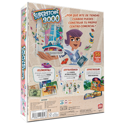 96 Módulos de centro comercial, 1 Dispensador 3000™, 56 Clientes, 16 tarjetas de Área recreativa, 14 piezas de Área recreativa, 4 piezas de Entrada principal, 1 tablero de Estacionamientos, 8 piezas de Estacionamiento, 12 fichas de Dinero inicial, 12 fichas de Globos, 4 reglas, 1 indicador de Participante inicial