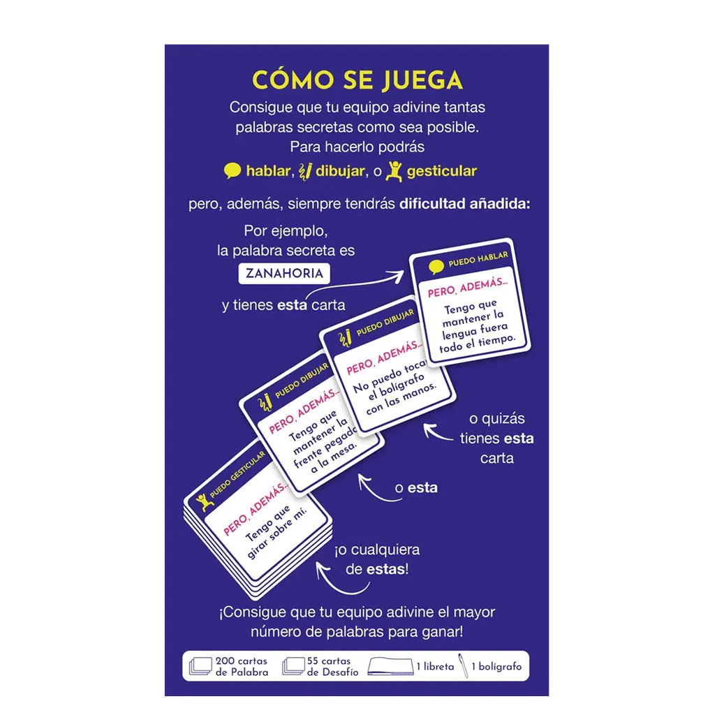En cada turno, una persona dará pistas siguiendo unas reglas concretas, por ejemplo, puede que solo tenga permitido hablar, dibujar o gesticular; pero, además, a esto tendrá que sumarle una dificultad añadida que complicará mucho las cosas. Vuestro equipo gana si adivina más palabras que el otro equipo antes de que se acabe el tiempo.