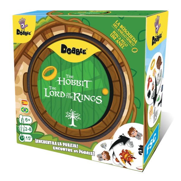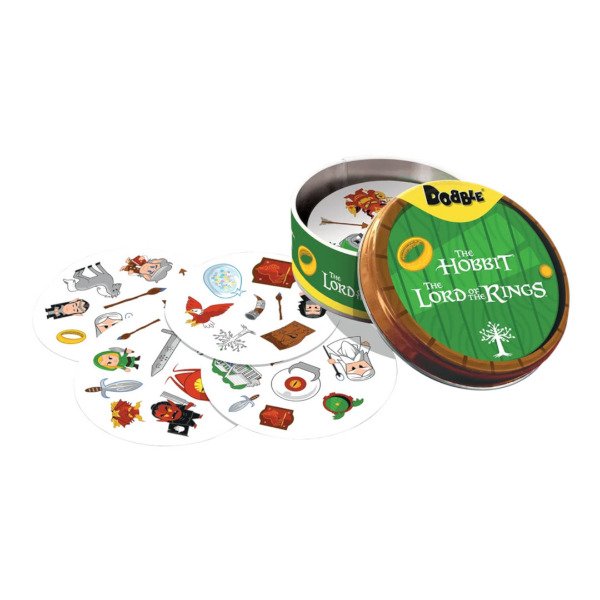 Dobble El Hobbit y el Señor de los Anillos es un juego en el que tendrás que descubrir qué personaje, objeto, bestia fantástica o símbolo, de las historias de Tolkien, se repite entre dos cartas. Si nunca has jugado a Dobble, toma dos cartas al azar y ponlas boca arriba sobre la mesa, a la vista de todos los jugadores y encuentren qué imagen se repite.