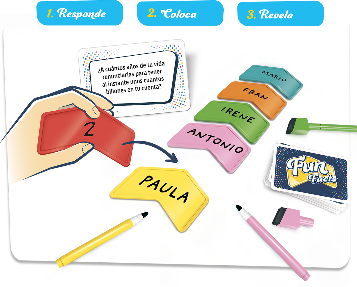 Con sus sencillas y atractivas reglas, Fun Facts te garantiza más de uno (y de dos) ataques de risa a medida que se vayan revelando toda una serie de impactantes secretos. Es el juego perfecto para conocerse los unos a los otros en un ambiente distentido y seguro. Eso sí, con Fun Facts, nunca estarás a salvo de sopresas: ¿O acaso sabes cuánts historias de amor tuvo tu abuela?