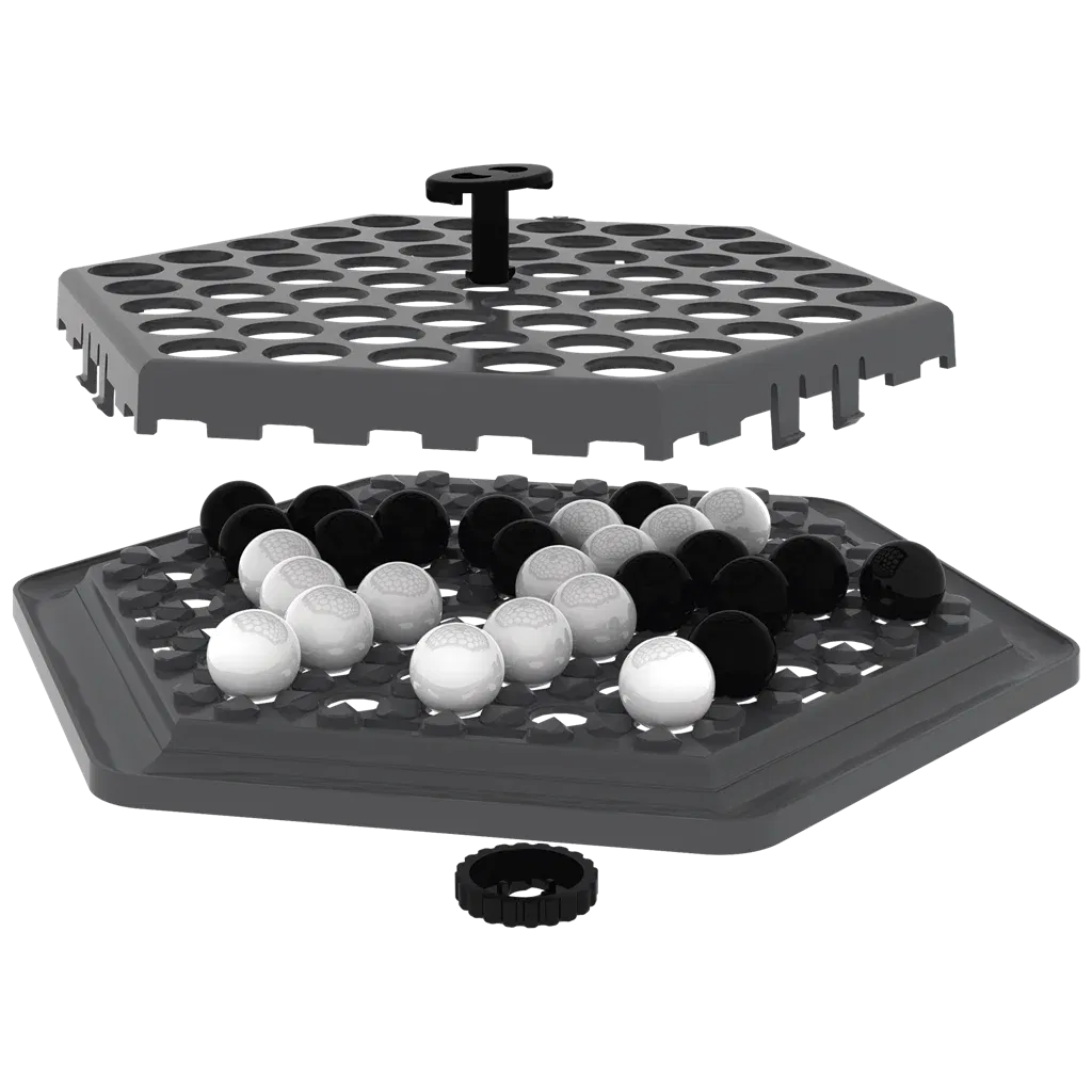 Dos bandos se enfrentan en un tablero hexagonal con Bolas blancas y negras. Para ganar, empuja 6 Bolas del oponente hacia el canal que hay en el borde del tablero.