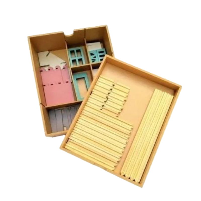- Base de madera de MDF de 15 mm, esmaltada. Tiene 20 ranuras para las columnas y 8 ranuras para poner las piezas de unión y juntarla a otra base.