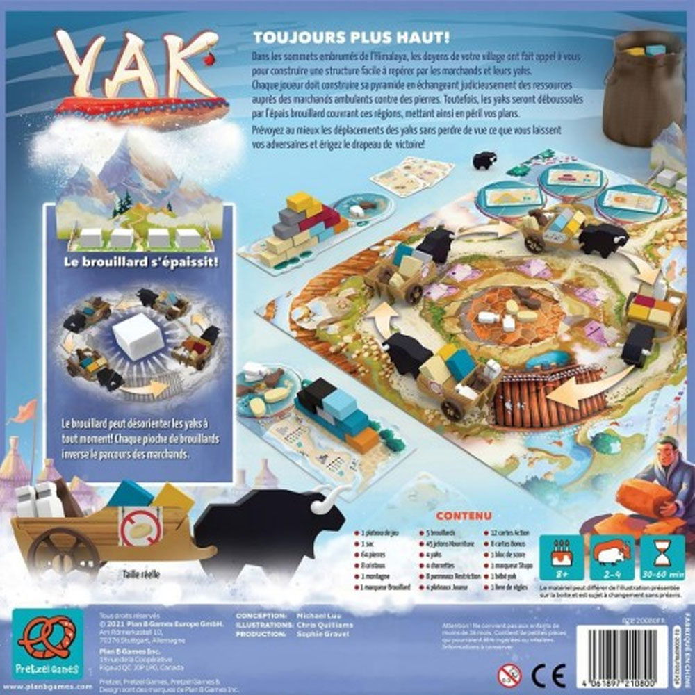 Yak es un juego de tablero, de 2 a 4 jugadores, en el que tendrás que construir una torre de piedra que permita guiar a los comerciantes ambulantes y a sus yaks a encontrar tu aldea, perdida en lo más remoto del Himalaya. La densa niebla dificultará la tarea, por lo que tendrás que trabajar duro para que los yaks no se desorienten y encuentren el camino.